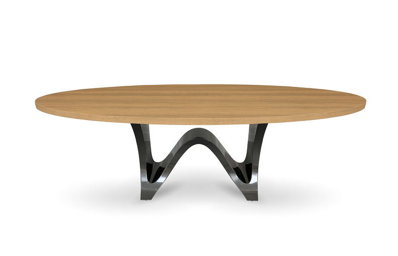 A titán felületű rozsdamentes acéllábon szépek a fény játékai. Az ovális fa furnérozott asztallap harmónikus egységet alkot az íves lábbal.